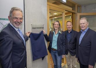 Zusammen mit Simone und Rüdiger Frankenberger enthüllte Bürgermeister Andreas Heidrich (links) das Schild des „Jürgen-Schmidt-Saals“ in der Verbandsgemeindeverwaltung. Jürgen Steup (rechts), damaliger zuständiger Erster Beigeordneter, begleitete vor 22 Jahren federführend die ordnungsgemäße und kostensparende Durchführung des Baus der Verbandsgemeindeverwaltung und arbeitete viele Jahre eng mit Jürgen Schmidt zusammen.