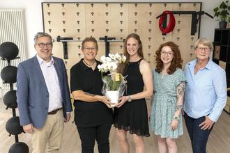 Karsten Lucke, 1. Beigeordneter der Verbandsgemeinde (l.) und Sabine Willwacher, Stadtbürgermeisterin (r.) gratulieren Bea Vogt, Lena Melchert und Luisa Dornseifer zur Erweiterung des PHYSIO-Ateliers.