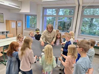 Mit Hilfe eines schwarzen Tuches und zwei Kugeln erklärte Sven Balmer zum Einstieg ins Thema Weltall den interessierten Kindern eindrücklich die Gravitation, von der auch die Laufbahn der Planeten abhängt. Foto: Daniela Gerhard