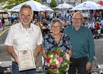 Anlässlich des Konzerts mit Mirko Santocono im Rahmen des Sommerfestivals der Stadt Bad Marienberg überreichte Bürgermeister Andreas Heidrich (links) den mit 250,00 € dotierten Kulturpreis der Verbandsgemeinde Bad Marienberg 2023 an Bettina Röder-Moldenhauer (Mitte) für ihren herausragenden jahrzehntelangen Einsatz für die Kultur und Stadt und Verbandsgemeinde Bad Marienberg. Mit der Preisträgerin freute sich der Kulturbeauftragte der Verbandsgemeinde Marco Stalp (rechts).