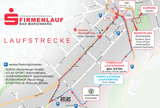 am Freitag, 13.09.2024 findet wieder der Sparkassen-Firmenlauf in Bad Marienberg statt. Auch in diesem Jahr wird zusätzlich ein Schülerlauf durchgeführt. Im Rahmen der gesamten Veranstaltung wird es zwischen ca. 16.00 und ca. 20.30 Uhr in der Innenstadt zu Verkehrsbeeinträchtigungen kommen. Insbesondere die Bereiche der Bismarckstraße, Bahnhofstraße, Gartenstraße, Fritz-von-Opel-Str. sowie der Langenbacher Straße werden in diesem Zeitraum nicht befahrbar sein. Sofern Sie Ihr Fahrzeug während dieser Zeit benötigen, bitten wir Sie, dieses vorher außerhalb des Veranstaltungsgeländes abzustellen. Die Umleitungsstrecken sind entsprechend ausgeschildert. Den Streckenplan der Laufveranstaltung entnehmen Sie bitte der Anlage.