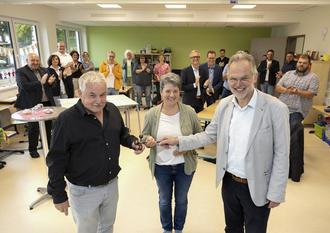 Im Rahmen einer kleinen Feierstunde konnten Schulleiterin Antje Krause und Bürgermeister Andreas Heidrich den symbolischen Schlüssel aus der Hand des beauftragten Architekten Thomas Schäfer (links) entgegennehmen und damit den Anbau offiziell seiner Bestimmung übergeben.