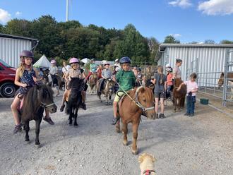 Auf gings ins Abenteuer mit tierischen Freunden und Menschen auf die stets Verlass war - hier selbstbewusst und umsichtig angeführt von Vanessa Weinbrenner (6 Jahre, ganz vorne), jüngste Tochter von Christina Weinbrenner, während Liliane und Jocelyn Weinbrenner (11 und 13 Jahre) sich, unterstützt von Jana Trippler (rechts im Bild) und Christina Weinbrenner selbst (links hervorschauend), um die “Neuen“ auf den Ponys kümmerten. Auch Emma, Lotta, Amelie und Hannes, die Kinder von Jana Tippler, waren selbstverständlich mit von der Partie und genossen das Abenteuer, ganz selbstbewusst im Umgang mit den Tieren und den 16 weiteren Kindern, ebenfalls sichtlich.