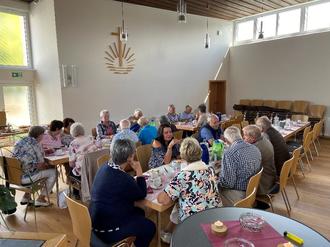 Ab 14:00 Uhr waren die Türen der Kirche geöffnet und erste Bürger und Bürgerinnen aus Hof trafen ein und konnten sich, nach einem gemeinsamen Tischgebet am Kuchenbuffet bedienen, der Kaffee wurde am Platz von fleißigen Helfern gereicht. Es konnten viele Gespräche miteinander geführt werden, manche der Teilnehmer konnten auf gemeinsame Begebenheiten von früheren Zeiten zurückblicken. Allgemein hatte man ja 3 Stunden Zeit, gemeinsame Erfahrungen auszutauschen. Die Zeit verging wie im Fluge und es konnten bei dieser Veranstaltung ca. 40 Teilnehmern begrüßt werden. Auch der Ortsbürgermeister, Herr Jochen Becker, sowie verschiedene Mitglieder der Kirchengemeinden aus der Umgebung wurden herzlich gerne in der Kirche begrüßt. Allgemein war man sich einig, ein solches Treffen wieder einmal auszurichten.