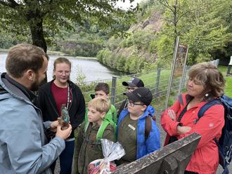 Das Programm des Nachmittages gestalteten Bärbel Kiehne (rechts im Bild), Michael Kiehne (nicht auf dem Foto) und Diplom Biologe Philipp Schiefenhövel von der Will und Liselott Masgeik-Stiftung (links im Bild). Dieser berichtete den Kindern gleich zu Beginn der Veranstaltung sehr anschaulich vom Eisvogel, einem spannenden Bewohner des Basaltparks. Dann kam der Kescher zum Einsatz, der viele Kleinstlebewesen bis hin zu Libellenlarven aus dem Wasser zu Tage brachte. Diese wurden dann in eigens dafür vorbereiteten Schalen auf ihre Besonderheiten untersucht und bestimmt, bevor sie wieder in die Freiheit entlassen wurden. Auch die Bestimmung der Flora im Basaltpark kam nicht zu kurz. Ausgestattet mit Fotokarten verschiedener Blattsorten machten sich die Kinder gruppenweise auf den Weg, die dazugehörigen Pflanzen zu finden. Die spannende Rallye mit Suchaufgaben entlang des Wegesrandes forderte die volle Aufmerksamkeit und machte allen ebenso viel Spaß. Als gegen Ende des Nachmittags alle vor dem heftig einsetzenden Regen in einem Holzunterstand gegenüber der Basaltwand Schutz suchten, passierte etwas, womit auch die erfahrenen NABU-Mitglieder nicht gerechnet hatten. Ein Uhu saß völlig unbeeindruckt auf einem heraushängenden Ast gegenüber in der Wand und wenig später kam ein weiterer angeflogen. Zur Freude und Begeisterung aller, blieb der Uhu einfach sitzen und ließ sich durch die mitgebrachten Spektive wie aus unmittelbarer Nähe beobachten. Dies war für alle das Highlight der Spurensuche im Basaltpark.
