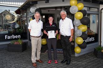 Die Urkunde zum Firmenjubiläum überreichte Bürgermeister Andreas Heidrich (links). Er zeigte sich beeindruckt von der Entwicklung des Unternehmens, insbesondere von der 200 m² großen Deko-Abteilung, die von Nicole Sahm (Mitte), die das Unternehmen in 4. Generation leitet, ins Sortiment aufgenommen wurde. Seniorchef Reiner Sahm (rechts) freute sich mit über den Besuch des Bürgermeisters.