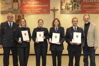 Für ihren Einsatz im ehrenamtlichen Feuerwehrdienst zeichnete Bürgermeister Andreas Heidrich (rechts) im Namen des Rheinland-Pfälzischen Innenministers Roger Lewentz (vorne von links) Anne-Colleen Schiewek, Johanna Benner und Franziska Helmer (alle Musikzug der FF Nistertal) sowie Dominik Heidrich (FF Dreisbach) für jeweils 15 Jahre ehrenamtlichen Dienst im Brandschutz mit dem Bronzenen Feuerwehrehrenzeichen des Landes aus. Unterstützt wurde der Bürgermeister vom stellvertretenden Verbandsgemeindewehrleiter Frank Schiffmann (hinten links).