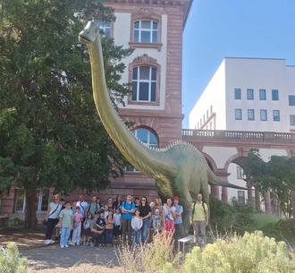 Gruppenbild mit Dinosaurier vor dem Senckenberg Museum in Frankfurt am Main