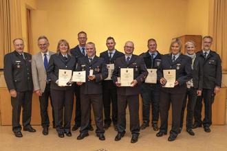Für 25 Jahre ehrenamtlichen aktiven Feuerwehrdienst erhielten Ramona Groth (FF Unnau), Daniel Lichtenthäler (FF Neunkhausen) Andreas Stübner (FF Unnau), Sascha Held (FF Fehl-Ritzhausen), Florian Neufurth (FF Neunkhausen), Steve Brenner (FF Norken) und Jasmin Schütz (FF Fehl-Ritzhausen) (von links) das Silberne Feuerwehr-Ehrenzeichen des Landes.