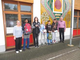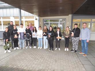 Schulleiter Thomas Eppendorf (rechts), Lehrer Karol Olszweski (zweiter von links) und Gerd Schell von der Verbandsgemeindeverwaltung (sechster von links) überbringen den Gewinnerinnen und Gewinnern der Realschule plus die Präsente. Die Schülerinnen und Schüler, die an diesem Tag wegen ihres Betriebspraktikums nicht teilnehmen konnten, erhalten ihren Gewinn nach den Herbstferien durch die Schule.