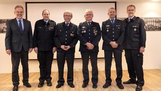 Fotos: Röder-Moldenhauer Für ihren besonderen Einsatz im ehrenamtlichen Feuerwehrdienst wurden Jürgen Groß (FF Neunkhausen, (3. v.l.), Mike Strunk (FF Langenbach b.K., 4. v.l.) und Kai Schimmelfennig (FF Bad Marienberg, 2. v.r.) für jeweils 45 Jahre aktiven ehrenamtlichen Dienst im Brandschutz mit dem Goldenen Feuerwehrehrenzeichen des Landes ausgezeichnet. Die außergewöhnlichen Ehrungen nahmen der Stellvertretende Brand- und Katastrophenschutzinspekteur des Westerwaldkreises Markus Brenner (rechts) und Bürgermeister Andreas Heidrich (links) gemeinsam vor. Mit den Geehrten freute sich der Stellvertretende Vorsitzende des Kreisfeuerwehrverbands Westerwald, Michael Itzeck (2. v.l.).