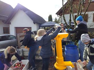 Wer viel schafft hat auch großen Hunger. Und so gab es in der Mittagspause in vereinter Runde leckere Pizza und Kuchen. Am Ende der tollen Gemeinschaftsaktion konnte neben dem Stolz auf sich und die anderen auch leckerer selbstgemachter Apfelsaft mit nach Hause genommen werden.