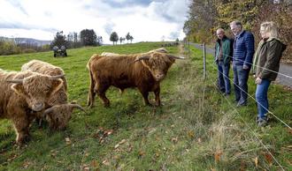 Beeindruckt zeigte sich Bürgermeister Andreas Heidrich (2.v.r.) von der imposanten Erscheinung der Schottischen Hochlandrinder, die auf dem Flurhof in Zinhain gehalten werden. Hier zu sehen sind Jungbullen aus der Nachzucht. Die Hofinhaber Ina und Martin Fischer gaben ihrem Gast einen informativen Einblick in ihren landwirtschaftlichen Betrieb. Fotos: Röder-Moldenhauer
