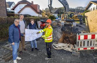Die Erdarbeiten im Zuge der Baumaßnahme Hohensayner Weg in Lautzenbrücken haben begonnen. Vom Fortgang der Arbeiten überzeugten sich (von links) Ortsbürgermeister Karsten Lucke, Bjorn Müller und Sabine Schlosser von der Werkleitung sowie Christof Kempf vom ausführenden Bauunternehmen.