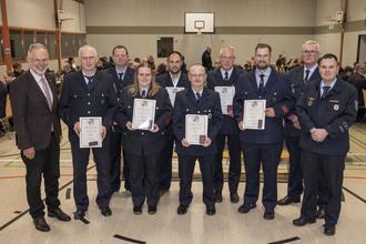 Löschmeister:innen bzw. Hauptlöschmeister:innen dürfen sich ab sofort nennen (von links) Michael Benner (FF Unnau), Florian Brückmann (FF Norken), Jenni Müller (FF Stockhausen-Illfurth), Patrick Schüler (FF Norken), Marco Schmidt (Hauptlöschmeister, FF Neunkhausen), Marco Biel (Hauptlöschmeister, FF Hahn), Marcel Kleinschmidt (FF Großseifen).