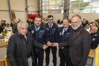 Zum Abschluss des offiziellen Teils überreichte Architekt Thomas Schäfer (links) den symbolischen Schlüssen des Gebäudes an den Bürgermeister und Wehrführer Pascal Schütz und dessen Stellvertreter Till Schmidt und Björn Mühlhaus (2. - 4.v.l.).