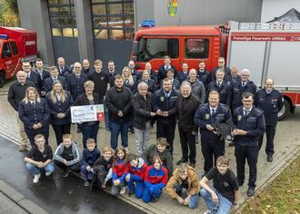Ortsbürgermeisterin Iris Wagner sprach von einem besonderen Tag für die Gemeinden Unnau und Bölsberg, deren Brandschutz von den Unnauer Feuerwehrleuten abgedeckt wird. Anschließend übergab sie den entsprechenden symbolischen Spendenscheck der Ortsgemeinde über die Unterstützung in Höhe von 15.000 € an den Bürgermeister und die örtliche Wehrführung.