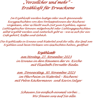 Hier erfahren sie Neuigkeiten und können alle ausleihbaren Medien aus unserem Bestand rund um die Uhr einsehen. Sie können während unserer Öffnungszeiten mittwochs und freitags von 17.00 - 19.00 Uhr unsere Medien ausleihen oder reservieren Sie Ihre gewünschten Medien telefonisch während unserer Öffnungszeiten oder direkt über Ihr Leserkonto auf unserer Homepage buecherei-nistertal.de unter dem Stichwort Medienkatalog, per E-Mail über buecherei-nistertal@freenet.de