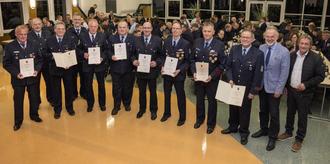 Mit den Geehrten freuten sich der stellvertretende Brand- und Katastrophenschutzinspekteur des Westerwaldkreises Markus Brenner (4.v.l.) und Verbandsgemeindewehrleiter Klaus Groß (2.v.l.).