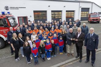 Zum Abschluss des offiziellen Teils überreichte Architekt Thomas Schäfer den symbolischen Schlüssel des Gebäudes im Kreise der Feuerwehrleute aus Neunkhausen an Bürgermeister Andreas Heidrich und Wehrführer Carsten Leonhardt (rechts).