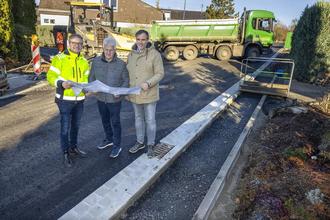 Insgesamt 1.556.000 € investierten Stadt und Verbandsgemeindewerke in die große Ausbaumaßnahme in der Zinhainer Wildparkstraße. Einen besonderen Dank sprach Björn Müller von den Verbandsgemeindewerken (rechts) Kai Müller (links) und seinem Team vom ausführenden Bauunternehmen Kurt Müller aus Bad Marienberg für den großen Einsatz und die gute Zusammenarbeit aus. Ulli Flick (Mitte) von der beauftragten Ingenieurgesellschaft Dr. Siekmann und Partner begleitet den Straßenausbau im Auftrag der Stadt.