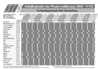 Bestimmt haben Sie ihn schon gefunden, oder? Diesem Heft ist der neue Abfallkalender des Westerwaldkreis-AbfallwirtschaftsBetriebes (WAB) für das Jahr 2026 beigelegt. Der Innenteil des Abfallkalenders enthält wie gewohnt ausführliche Informationen über das Abfuhrsystem im Westerwaldkreis. Neben der genauen Beschreibung der wöchentlichen Abfuhr sind hier auch Infos zur Kühlschrank-, Elektroaltgeräte-, Wertstoffschrott- und Sonderabfallentsorgung sowie nähere Erläuterungen zur Sperrabfall- und Grünabfallentsorgung aufgeführt.