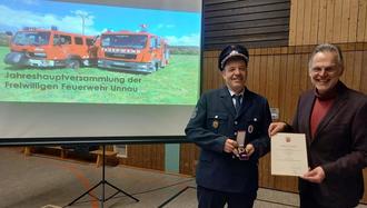 Im Rahmen der Jahreshauptversammlung der Freiwilligen Feuerwehr Unnau konnte Bürgermeister Andreas Heidrich eine hohe Ehrung vornehmen: Für 35 Jahre aktiven ehrenamtlichen Feuerwehrdienst in der Freiwilligen Feuerwehr Unnau erhielt Heiko Schütz das Goldene Feuerwehrehrenzeichen des Landes Rheinland-Pfalz. Der Löschmeister war bereits 1987 in die Unnauer Wehr eingetreten und hat sich über seine langen Dienstjahre mit zahlreichen Lehrgängen qualifiziert.