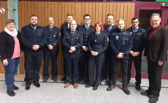 Bürgermeister Andreas Heidrich (rechts) sprach im Rahmen der Jahreshauptversammlung der Freiwilligen Feuerwehr Unnau einige Beförderungen und eine Verpflichtung aus. Seine Beförderung zum Oberfeuerwehrmann erhielt Marcel Wendland (5. v.l.). Niklas Groth, René Knapp, Evelyn Petry und Felix Werner Blümel (4., 6.-8. v.l.) wurden zum/zur Feuerwehrmann bzw. -frau befördert. Zum Feuerwehrdienst verpflichtet wurde Chris-André Stübner (3.v.r.). Mit den Ernannten freuten sich Ortsbürgermeisterin Iris Wagner, Wehrführer Pascal Schütz, Heiko Schütz (von links) sowie der Stellvertretende Wehrführer Till Schmidt (2.v.r.).