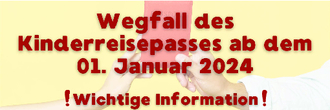 Bitte beachten Sie, dass ab dem 01.01.2024 Kinderreisepässe nicht mehr beantragt, verlängert oder aktualisiert werden können.