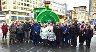 Jugendliche, Familien und Senioren hatten trotz grauem Regenwetter gleichermaßen Spaß beim ganztägigen gemeinsamen Entdecken der vielfältigen internationalen Angebote des Essener Weihnachtsmarktes und seiner besonderen Atmosphäre, hier vor einer Süßigkeiten-Lok am Eingang des Weihnachtsmarktes