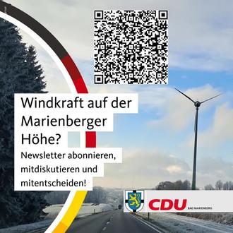 Die CDU Bad Marienberg (Ortsverband) teilt mit: Aktuell ist zu beobachten, dass die Debatte, ob und wo neue Windkraftanlagen in der VG errichtet werden sollen, aufs Neue an Fahrt aufnimmt. Die Verbandsgemeinde passt derzeit mit der 7. Fortschreibung des Flächennutzungsplans das geltende Planungsrecht an. Dabei sollen die ausgewiesenen Sondergebiete für die Windenergienutzung und die Gesamthöhenbeschränkung für Anlagen auf 99 m entfallen. Vor dem Hintergund der Energiekrise und der Energiewende forcieren insbesondere Bundes- und Landesregierung den Ausbau der Erneuerbaren Energien. Die Hintergründe und die Entwicklungen in den benachbarten Ortsgemeinden beleuchten wir in der aktuellen Ausgabe unseres Newsletters im Detail (wer sich über den QR-Code oder https://bit.ly/3FqJ8xt anmeldet, erhält 1-2 Tage später den aktuellen Newsletter). Ebenso gehen wir darauf ein, was sich gegenüber dem Jahr 2014 verändert hat, als in der VG eine Entscheidung gegen Windkraft getroffen wurde.