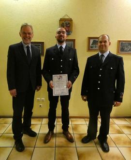 Bei der letzten Jahreshauptversammlung des Fördervereins der Freiwilligen Feuerwehr Stockhausen-Illfurth konnte sich Nils Andexser (Mitte) im Beisein von Wehrführer Patrick Müller (rechts) über die Ernennung zum Stellvertretenden Wehrführer freuen, die ihm von Bürgermeister Andreas Heidrich (links) ausgesprochen wurde.
