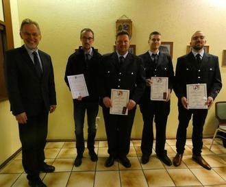 Nils Andexser (links) wurde bei der Veranstaltung auch noch zum Brandmeister befördert und zum Gruppenführer bestellt. Florian Pink (2.v.l.) wurde zum aktiven Feuerwehrdienst verpflichtet. Über die Ernennung zum Feuerwehrmann freuten sich Markus Henninger (3.v.l.) und Philip Michels (2.v.r.).