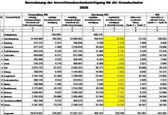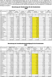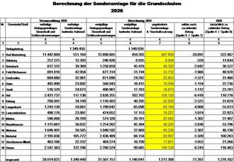 Neben der allgemeinen Verbandsgemeindeumlage wird für die Grundschulen von den aufgeführten Gemeinden und der Stadt nach den angegebenen Maßstäben (Spalte 3) eine Sonderumlage gemäß § 26 Abs. 2 LFAG erhoben (Spalte 4). Die Höhe der Sonderumlage errechnet sich aus dem Finanzmittelfehlbedarf der Produkte 2111 bis 2115. Unter Einbeziehung der Abrechnung ergebenen sich die tatsächlich zu erhebenden Beträge aus Spalte 9: