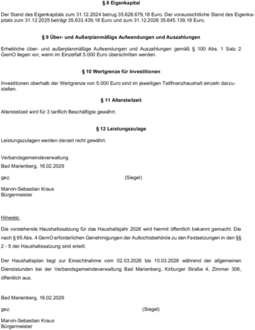 Die vorstehende Haushaltssatzung für das Haushaltsjahr 2026 wird hiermit öffentlich bekannt gemacht. Die nach § 95 Abs. 4 GemO erforderlichen Genehmigungen der Aufsichtsbehörde zu den Festsetzungen in den §§ 2 - 5 der Haushaltssatzung sind erteilt.