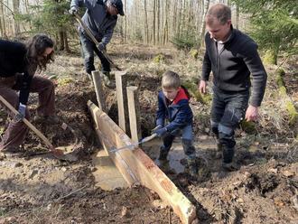 Matteo Stinner (8 Jahre) baut mit seinem Vater und weiteren Helfern eine Stauschwelle aus Holz Fotorechte: Landesforsten.RLP.de / Pia Schlunk