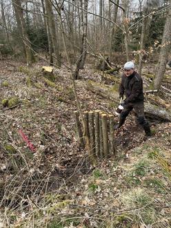 Der Privatwaldbesitzer Dr. Martin Hagner verschließt einen historischen Entwässerungsgraben mit Hilfe von Erlenpflöcken, die mit Weiden umflochten werden und so langfristig den Wasserabfluss reduzieren. Fotorechte: Landesforsten.RLP.de / Marie Donath