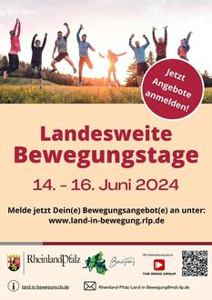 Bereits zum vierten Mal plant die Landesinitiative „Rheinland-Pfalz - Land in Bewegung“ gemeinsam mit vielen Partnern, die landesweiten Bewegungstage vom 14. bis 16. Juni 2024.