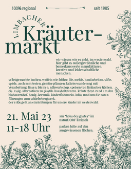 In Limbach legen wir schon seit vielen Jahrzehnten Wert auf einen rücksichtsvollen und nachhaltigen Umgang mit der Natur. Nachzulesen auf der DORFhomepage (www.limbach-ww.de) unter DORFentwicklung/Leitidee „NaturDORF“. In dieser Tradition steht auch der seit 1985 alle zwei Jahre stattfindende Kräutermarkt. Nach pandemiebedingter Pause findet er an diesem Sonntag inzwischen zum 17. Mal statt. Präsentiert wird am Haus des Gastes ein bunter Strauß an naturbezogenen regionalen Angeboten. Um 12, 14 und 16 Uhr findet jeweils eine Kräuterwanderung mit anschließender Verarbeitung statt. Weitere Infos und Fotos auf www.limbach-ww.de.