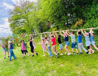 Dort bastelten sie liebevoll Kids-Club-Anhänger und schmückten die Birke, bevor er feierlich aufgestellt wurde. „Der erste Kids-Club-Maibaum!“