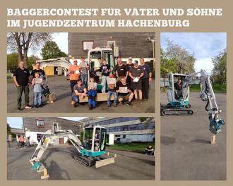 „Wenn der Vater mit dem Sohne“ einen Bagger-Contest bestreitet. Am JuZe wurden am Samstag, den 13. April schwere Geschütze aufgefahren. Die insgesamt sieben Teams aus Söhnen mit ihren Vätern sollten einen echten Bagger mit dem nötigen Geschick und Feingefühl bedienen und so gemeinsam verschiedene Aufgaben meistern. Durch die freundliche Unterstützung der Firma Thomas Orthey aus Hattert, die den Bagger bereitstellte, und unter fachlicher Anleitung konnte die ganze Aktion sicher und mit jeder Menge Spaß vonstattengehen. Der Parcours, der auf dem Parkplatz vor dem Jugendzentrum aufgebaut worden war, bestand aus insgesamt vier Stationen, es galt Geschicklichkeit an den Joysticks des Baggers zu beweisen und dabei möglichst schnell zu sein. Beispielsweise mussten Holzklötze, an denen Drahtschlaufen befestigt waren, mit einem Haken am Baggerarm aufgenommen und aufeinandergestapelt werden. Nach der Erklärung des Parcours wurde jedes Team kurz in die Bedienung des Baggers eingewiesen und bekam die Möglichkeit unter Anleitung erste Manöver durchzuführen. Danach konnte der Contest beginnen. In die Bewertung flossen jeweils die Zeit und die erledigten Aufgaben ein. Daraus ergaben sich am Ende die Platzierungen. Ein spannendes Stechen um den ersten Platz fand zwischen den punktgleichen Jungs Louis und Ben statt, welches Louis für sich entscheiden konnte. Die Teams, die die Plätze eins bis drei erreicht hatten, wurden dafür mit Preisen belohnt. Alle anderen bekamen einen von der Firma Orthey gestifteten Trostpreis. Jedes Team bekam auch eine Urkunde. Da Baggerfahren sehr hungrig machte, wurde parallel zum Wettkampf der Grill angefeuert, sodass alle sich gemütlich und mit leckerem Essen zwischendurch stärken konnten. Die Kids, die vom Baggern noch nicht genug hatten, und das waren natürlich alle, konnten sich nach dem Contest noch zwei Stationen aussuchen, die sie noch einmal absolvieren durften.