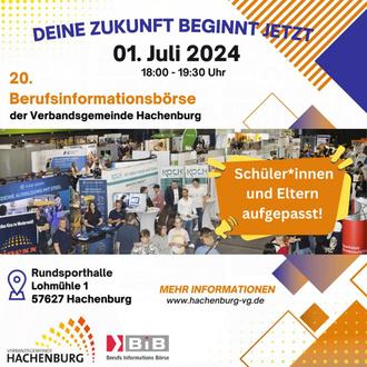 Die Verbandsgemeinde lädt alle Schülerinnen und Schüler zur kommenden Berufsinformationsbörse am 01. Juli 2024 in der Rundsporthalle Hachenburg ein. Von 18:00 - 19:30 Uhr können sich potenzielle Auszubildende mit den Unternehmen austauschen und sich über Ausbildungsberufe und -angebote informieren.