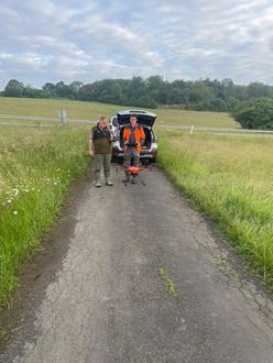 Am Sonntagmorgen um 05.30 Uhr haben die Steinebacher Jäger und Sascha Ladewig mit der neu angeschafften Drohne vor dem Mähen die Wiesen nach Rehkitzen abgesucht. Zum Glück sind die Kitze mittlerweile so weit, dass sie von uns aufgeschreckt, selbstständig aus dem hohen Gras fliehen konnten.