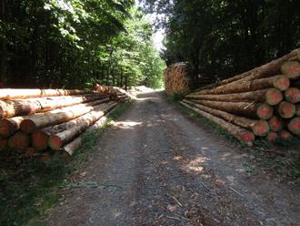Knapp ein halbes Jahrhundert später liegen die letzten Borkenkäfer-geschädigten Exemplare abholbereit am Waldweg.