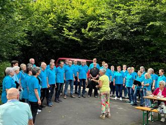 Bei bestem Wetter zog es viele Menschen am ersten Juli-Sonntag an die evangelische Kapelle Atzelgift/Luckenbach, wo engagierte Mitglieder der evangelischen Kirchengemeinde Kuchen und Getränke bereitgestellt hatten, damit sich Menschen begegnen und ins Gespräch kommen, aber auch die Kapelle besuchen. Die musikalische Gestaltung übernahm der Gemischte Chor Kundert (s. Foto von Angelika Dobe).