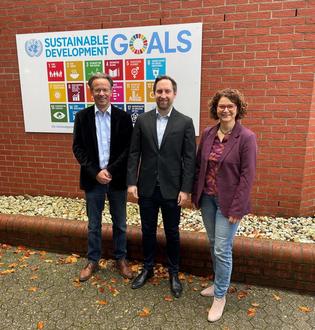 Der Erste Beigeordnete Marco Dörner, Nachhaltigkeitskoordinator Timo Karl und die Bürgermeisterin der Verbandsgemeinde Hachenburg, Gabriele Greis, vor der Tafel mit den globalen Nachhaltigkeitszielen, welche gut sichtbar am Eingang des Verwaltungsgebäudes angebracht worden sind.