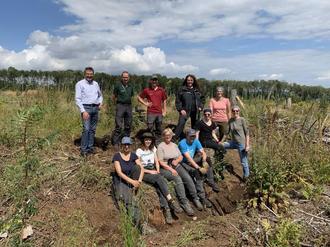 Verantwortliche und Freiwillige der Projektwoche (hintere Reihe v.l.n.r.: Markus Kurtseifer (Vorstandsmitglied Westerwald Bank eG), Martin Kessler (Revierleiter Alpenrod/Gehlert), Phillip Holl (Fachliche Konzeption, Forstliches Bildungszentrum), Monika Runkel (Leiterin Forstamt Hachenburg), Urla Ewender (Projektleiterin des Bergwaldprojekts). Vodere Reihe: Freiwillige des Bergwaldprojekts).