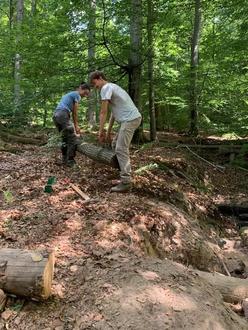 Freiwillige tragen Baumstämme durch den Wald, um sie in Wasserrinnen zu verbauen. Ziel ist es, das Wasser im Wald zu halten und Hochwasser vorzusorgen.