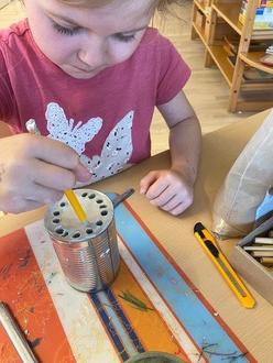 Ein Kind der Kindertagesstätte Dreilindenstein bei der Gestaltung eines „Insektenhotels.
