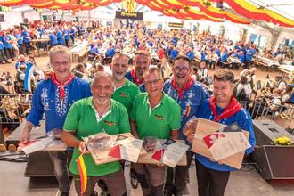 Die Spannung stieg im Zelt, als Leukel die Identität des Preisträgers durch Andeutungen enthüllte: Der Bürger des Jahres sei „zu einem Drittel Altstädter und zu einem Sechstel Hachenburger“. Schließlich lüftete er das gut gehütete Geheimnis: „Es sind die Wagenbesatzungen von HUI, WÄLLER und ALLEMOL - die Hachenburger Frischlinge!“ Tosender Applaus brandete auf, als das Rallyeteam, bestehend aus Bruno Meder (Orga-Frischling), Markus Windhagen (Schreiner-Frischling), Markus Grodtmann (Pharma-Frischling), Stefan Andres (Schrauber-Frischling), Bernd Hilz (Navi-Frischling) und Lars Hümmeler (Presse-Frischling), die Bühne betrat.